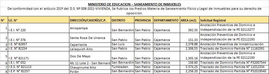 De conformidad con el artículo 251° del D.S. N° 008-2021-VIVIENDA, Se Publica los Predios Materia de Saneamiento Físico y Legal de inmuebles para su derecho de oposición: